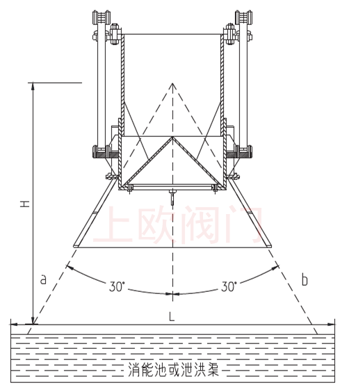 (2) 帶整流罩型(限制發散型):利用導流罩有效控制錐形閥的出口發散程度:都用于水頭高,出口狹小,涉及建筑物或其他設施等;如圖所示,用戶應根據設計消能池或泄洪渠的具體尺寸選擇合適的導流罩,具體如圖所示,a、 b為導流罩的夾角延長線,L為消能池或泄洪渠的寬度,H為導流罩夾角頂部到消能池或泄洪渠表面的高度,按等邊三角形原理計算該選用的導流罩角度。
