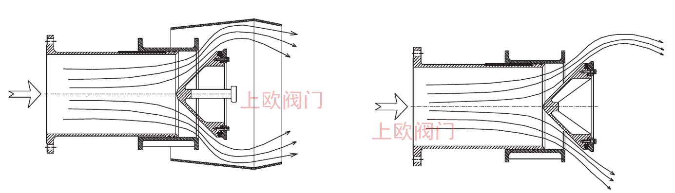 有整流罩與無整流罩的出流示意(一般情況加有整流罩會略降低閥門流量系數2—3%)