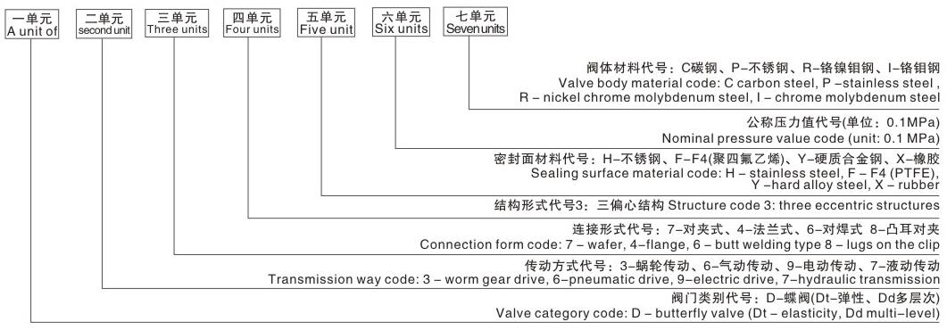例一、D373H-25C表示:1.蝶閥(D) 2.蝸輪傳動(3) 3.對夾式連接(7) 4.三偏心結構⑶  5.不銹鋼密封圈(H) 6.公稱壓力2.5MPa(25)  7.碳鋼閥體(C);